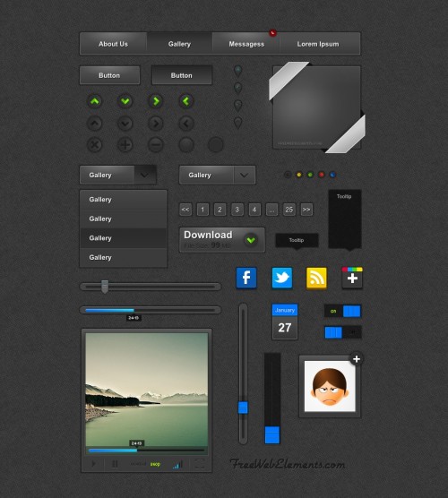This set of web page UI elements was created for specifically for dark and heavily-styled web pages. The UI Kit includes most common web design elements and is perfect for mocking up designs. In this pack you can find more than +50 elements for website design