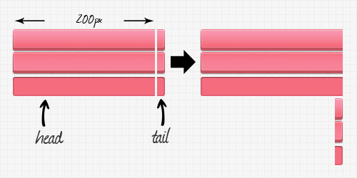 Preparing an image sprite can be very tricky especially for button. First of all, we need to know that this button will be flexible, which means the width of button will expand according to the caption length. This is how we do it, we divide the button into two sections – body and tail. Then, We added extra width to the button body to 200px and move all the tails to the bottom. This is the result of our image sprite: