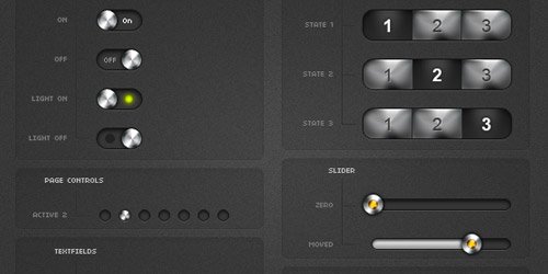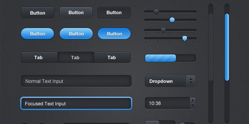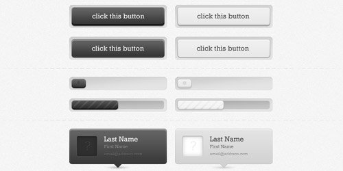 Free resizable vector slick UI elements available as Free PSD file. Contains slider, buttons, progress bar, tooltips. Great for interfaces.